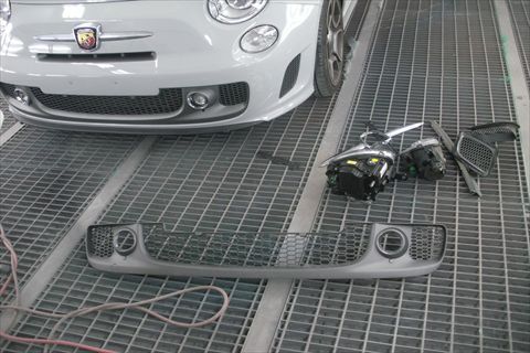 フィアットのアバルト(ABA-312142) :傷の修理方法と費用 フロントバンパー脱着、修理、塗装、他/バンパーグリル、ヘッドランプ、他交換 〔自動車保険利用〕