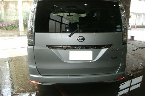 セレナのリアバンパー、バックドアなどの凹みを板金にて修理、パーツ交換などを行いました。
