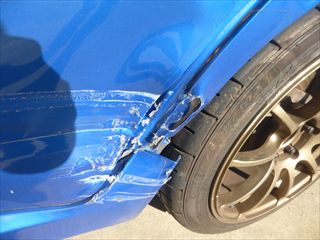 スバルのインプレッサ(CBA-GRB):傷の修理方法と費用 左リアドアパネル、左リアアウタクォーク、左サイドスポイラ他の交換、ホイールハウスインナー板金、塗装、他