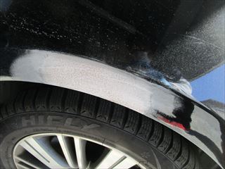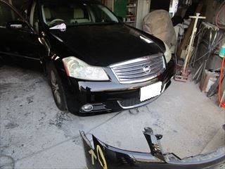 日産のフーガ(DBA-PY50):傷の修理方法 フロントバンパーフェイシア、右ヘッドランプの脱着、右フロントフェンダの鈑金、その他の部品交換、塗装